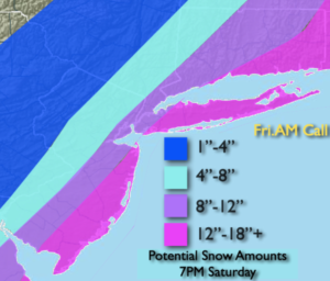 The deepening area of low pressure will be moving up and off the Mid-Atlantic and Northeast coast Friday night and Saturday. Snow will break out Friday night. The snow will become heavy at times along and to the South and East of I-95 on Saturday.. The exact track (as always) will determine how far West the heavy snow bands will get. The latest computer guidance has put the storm closer to the coast resulting in higher snow amounts in all areas. There will be a sharp cutoff to the heavy snow to the North and West of the City. This will be the possible “Bust Zone”. If the storm track is farther East, lighter accumulations will occur. If the track is closer to the coast this area will also receive a significant snowfall. The map above is a “Friday AM Call ” for snowfall by 7pm Saturday. Again, nothing is etched in stone. Please keep it here for no hype, no nonsense forecast. A “Last Call” snow amounts map will be issued Friday afternoon.