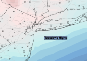 Partly cloudy.Not as cold as recent nights. Lows in the lower to mid 30s in the City, the teens and 20s inland. Light winds.