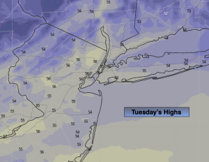 Mostly sunny skies are expected today as strong high pressure influences our weather from Southeastern Canada . The flow will be out of North which equates to chilly readings. Temperatures will be below the seasonal averages of the lower 60s. Highs will remain in the 50s through the period.