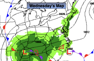 Today will feature more clouds as low pressure begins to develop well to our South and West. Spotty showers are possible along Southern coastal areas. The low will move up the spine of the Appalachians on Thursday. The flow around this low will bring a slug of rain up from the South Thursday. This looks to be a quick hitter with some downpours and gusty winds. One to three inches of rain is possible with local street and highway flooding. Fallen leaves may leave drains clogged adding to ponding of water. Minor coastal flooding is possible at times of high tide.