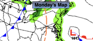 Clouds will rule the sky today. The combination of a weak low moving up and off the coast and an approaching cool front will spark a few scattered showers. This looks more likely toward the coast. Tuesday will be mostly sunny, breezy and cool as a Canadian airmass pays us a visit. Wednesday will feature plenty of sun and pleasant conditions. Another shot of cooler air from the North will arrive for Thursday under mostly sunny skies. Friday will be bright and seasonable.