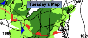Tuesday will feature a warm front moving toward the area. Clouds will rule with areas of rain developing during the afternoon. Readings will be near the average highs of the lower 50s.