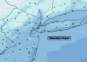 It’ll be a 50/50 split weekend. High pressure will be overhead for Saturday. This will result in mainly sunny skies and chilly readings. Highs will be several degrees below the average high of around 50º. A cool front will approach on Sunday. Spotty morning showers turn to a period of rain during the early afternoon.