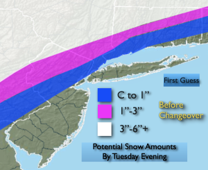 Now to Tuesday. There will be low pressure developing over the Southeast. This low will move up and off the our coastline while strengthening. At the onset it will be cold enough for some wet snow to develop along and North and West of the I-95 corridor during the mid morning hours. A quick slushy coating is possible in this area at most. It will turn to all rain. Cold high pressure is lacking to our North. The wind will come off the milder Atlantic waters during the day. Any snow or mix will go over to rain over the nearby suburbs. Inland a mix of snow and rain will continue. In this region accumulation is likely, especially over the higher elevations. The first guess map is above. These are potential amounts and are not etched in stone. Several inches of snow is possible well inland. The storm will pull away Tuesday evening with precipitation coming to an end.