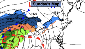 Sunday will feature more clouds as a warm front heads our way from the South. The wind will be off the colder Atlantic. Highs will be near the seasonal averages of the upper 40s.