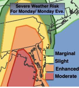 A deep Southerly flow will develop today ahead of a cold front. This will cause temperatures to pop into the 60s. Showers are possible just about anytime. Some of the rainfall will be heavy. An inch of rain will be common. It’ll be windy. Thunderstorms may accompany the front by evening. Some of the storms may turn severe, especially over Southern and Western sections (map above). The timing for the potential severe storms looks to be between 5pm-11pm.