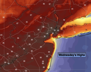 Our Summer preview will continue through Thursday with highs reaching well into the 80s to around 90º. Temperatures will be cooler at the coast and over Long Island with a cooler Atlantic influence. Record highs are likely today. The record for Central Park is 87º set in 1941. We will be around 90º today. The weather pattern will be more reminiscent of July than April as a Bermuda high dominates. A mix of sun and clouds is expected. A spotty thunderstorm is possible tonight with a weak disturbance moving through.