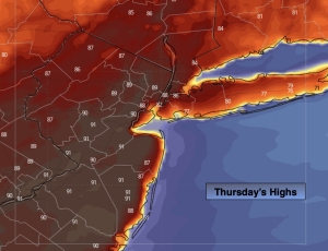 Our Summer preview will continue through today with highs reaching well into the 80s to around 90º. Temperatures will be cooler at the coast and over Long Island with an Atlantic influence. Record highs for Thursday looked to be just missed. The record for Central Park for Thursday is 92 set in 2002. The weather pattern will be more reminiscent of July than April as a Bermuda high dominates. A mix of sun and clouds is expected.