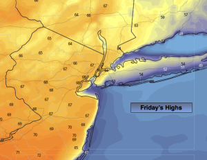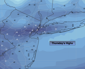Moderating temperatures are expected at the end of the week with a Southwest winds around an Atlantic high. Skies will be bright.