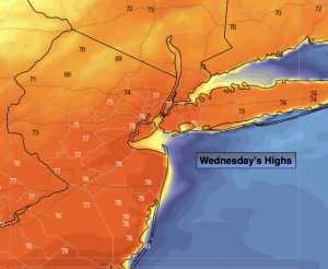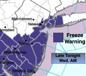 A freeze is likely for most of the area tonight as a Canadian high moves overhead. Wednesday will be chilly but bright. Readings will be around ten degrees below the average high of the upper 50s.