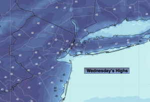 Sunny. Chilly. Highs around 50º. Northeast to Southeast winds at 5-10mph.