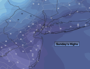 Partly cloudy. Cold inland with scattered areas of frost. Lows in the mid 40s in the City, the 30s inland. Light Southeast wind.