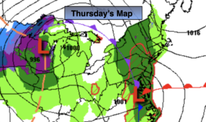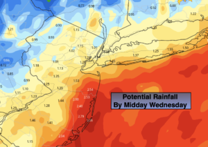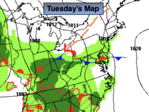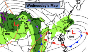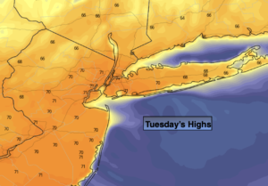 Wednesday’s temperature will depend on your location. The warm front that moves through today will drift back South for a time on Wednesday. Cooler air will work in from New England. From the City and to the North and East temperatures will be in the 50s and 60s. From the City and to the South and West readings will pop well into the 70s. More clouds than sun is expected.