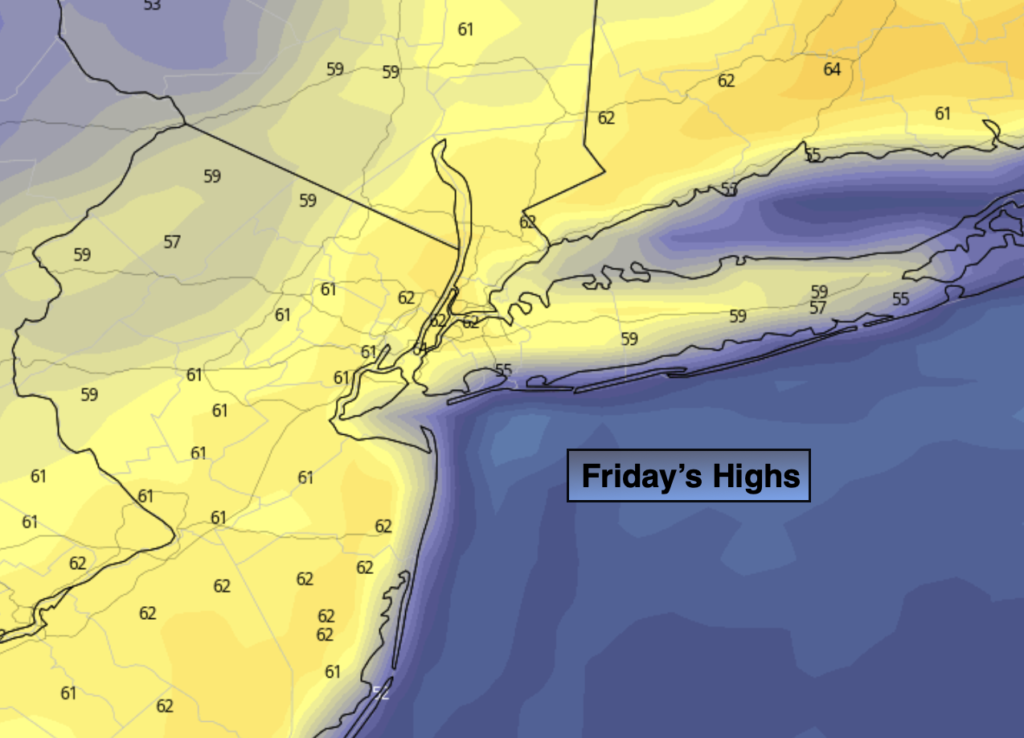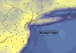 Mostly cloudy. Mild. Lows in the lower to mid 50s in the City, the 40s inland. East wind less than 5mph.