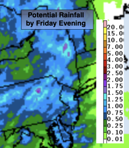 By Friday, a warm front will push through our region. Scattered showers are possible.