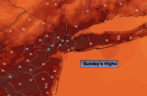 Relief will arrive on Sunday as a Canadian airmass moves in. Temperatures will be near the seasonable averages of the mid 80s.