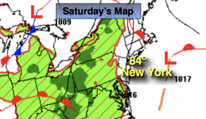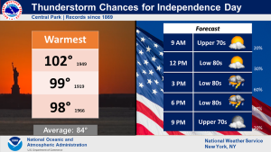 The beginning of the 4th of July weekend on Saturday will feature more clouds than sun. Scattered showers and storms are possible in the afternoon as a warm front approaches. The threat of showers and storms will continue for through Tuesday, July 4th as a weak disturbance remains over the region. It’ll be hazy and humid. It will not be a washout. Readings will be around the seasonable averages of the lower to mid 80s.