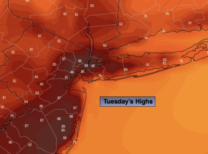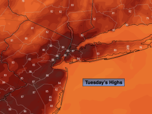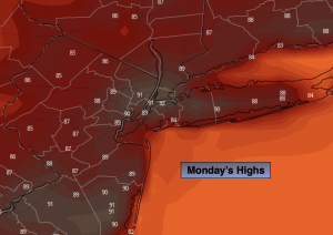 On Monday we’ll dry out. Bright, hot conditions are anticipated as weak high pressure develops over the region. Readings will be about five degrees above the average high of 85º.