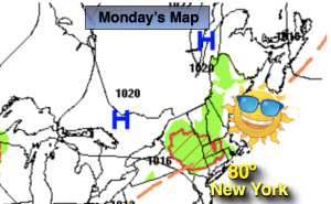 Isolated showers or storm. Muggy. Lows around 70º in the City, the mid 60s inland. Southeast winds less than 5mph.