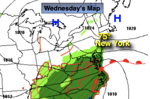 Scattered showers and storms. Muggy. Lows in the upper 60s in the City, the mid 60s inland. Southeast winds less than 5mph.