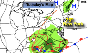 Scattered showers and storms early. Muggy. Lows around 70º in the City, the mid 60s inland. Southeast winds 5mph.