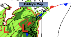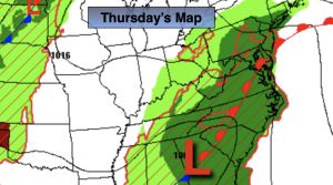 Moisture from a weak low over the Southern Appalachians will move North tonight and Thursday. Showers or even a period of rain is expected Thursday. The threat of showers (and an afternoon thunderstorm) will stick around Friday but it won’t be steady or widespread.