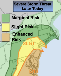A mix of sun and clouds is expected for Monday. Widely scattered showers and isolated storms are possible for the first half of the day. Much of the time will be dry. It’ll be warm with readings getting above the average high of the lower 80s by a few degrees. The humidity will be noticeable. There’s a slight to enhanced risk of severe thunderstorms later this afternoon and evening. Damaging winds, torrential rain and frequent cloud to ground lighting is possible. Keep an eye to the sky for threatening weather after 2pm.