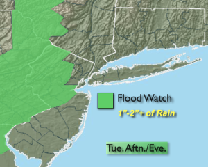 Weak low pressure over the Northeast will be responsible for the shower and storm threat through Wednesday. It will not be a washout, but areas that get into the heavier rain in the Flood Watch area can have a repeat performance with flooding later today.