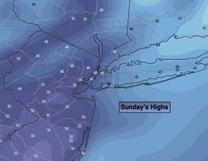 Sunday will feature a much brighter sky with readings a few degrees above the average of the lower to m id 40s.