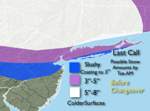 First potential snow map of the seaon and it took until the end of February to create it! I’ve been doing this for a couple of decades (and then some)- this is the latest ever. It all starts Monday evening from West to East and tapers off Tuesday morning. The amounts are before any changeover in the Southern bands. The bust zone is the Southern most swath. Remember this is not etched in stone but the current thinking at this time. The amounts will most likely alter some. Farther to the South, any frozen precipitation will go over to rain. A light mix or light rain will continue into the first half of Tuesday. Clouds will hang tough,