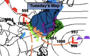 The first potential snow map of the season is above and it took until the end of February to create it! I’ve been doing this for a couple of decades (and then some)- this is the latest ever to create a snow map. It all starts Monday evening from West to East and tapers off Tuesday morning. The amounts are before any changeover in the Southern bands. Yes, sleet will most likely mix in for a majority of the region. The bust zone is the Southern most swath. Remember this is not etched in stone but the current thinking at this time. The amounts will most likely alter some. Farther to the South, any frozen precipitation will go over to rain. A light mix or light rain will continue into the first half of Tuesday. Clouds will hang tough,