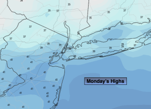 Clear and cold. Lows in the upper 20s in the City, the teens inland. North wind at 5-10mph.